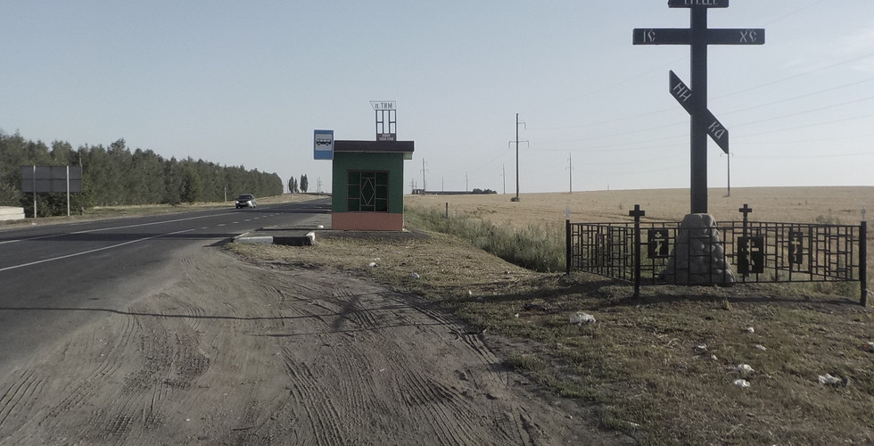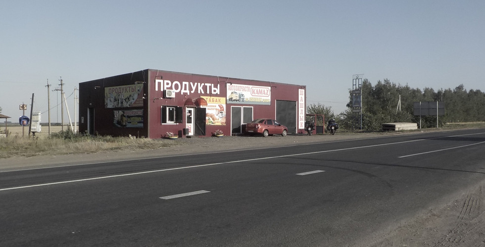 Nachdem ein abendlicher Wasserleitungsbruch im Hotel souverän von der Portiersfrau behoben worden war, konnten wir am nächsten Tag frisch und ausgeruht starten. Der Grenz-übertritt verlief ohne große Probleme, wir mussten nur etwas Schmiergeld in der Ukraine zahlen und ganz viel Papierkram am russischen Grenzposten ausfüllen. Mit den Motorrädern fuhren wir anschließend durch zahllose Dörfer, in denen häufig zwei Reihen meist kleiner quadratischer Häuser mit liebevoll gestrichenen Zäunen und Fensterläden die Straße säumen, von der sie durch einen breiten Grünstreifen getrennt sind, auf dem Haustiere weiden. Nachmittags machten wir Rast an einem Waldrand, den wir über staubige Wege aus der für diese Gegend so typischen russischen Schwarzerde erreicht haben. Windräder und Solarzellen haben wir hier übrigens noch nirgendwo gesehen. Sonntagabend zelteten wir dann wieder. Auf dem Weg dahin kam es zu einem kleineren Unfall: Leo geriet in eine Spurrille und fiel mit dem Motorrad hin. Passiert ist Ihm dabei nichts, nur die Kofferhaltung am Motorrad ging zu Bruch, konnte jedoch mit Spanngurten provisorisch ersetzt werden.